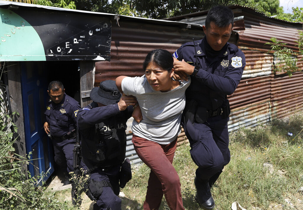 Gli agenti di polizia salvadoregni arrestano una donna accusata di aver minacciato un’altra persona, nel quartiere di Soyapango, El Salvador, giovedì 2 marzo 2023. Da un anno il paese vive nello stato di eccezione decretato dal presidente Bukele per la lotta alle bande criminali. (Foto AP/Salvador Melendez)