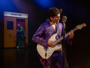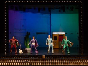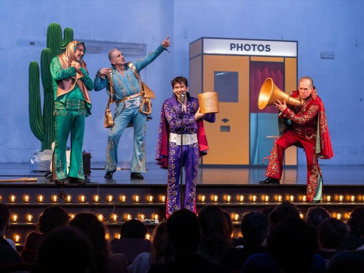Vestiti con sgargianti costumi alla Elvis Presley, con svolazzanti mantelli, stivali e giubbotti con borchie, i magnifici 4 – che dire di Michele Andrei, Paolo Giovannucci, Stefano Laguni e Isacco Venturini? Bravissimi, con i giusti tempi comici, da farsa, da commedia, da concerto –, intavolano discussioni surreali, argomentando e filosofeggiando su questioni sociali, economiche, esistenziali, spirituali, di linguaggio e comunicazione (aleggiano Beckett e Brecht), di social e di convenzioni teatrali (si citano Ronconi, Castri, Strehler, lo stesso regista con l’autoironica battuta espressa dal Povero: «Latella che fa finta di fare il teatro povero»); di capitalismo, consumismo, e di imbarbarimento delle città (sotto accusa la, non più, Milano da bere). Scendono in platea ammiccando col pubblico, anche provocandolo cinicamente; si insultano, duellano, giocano con le parole, con i nonsense, accennano goffi passi di danza, e, appena inavvertitamente qualcuno pronuncia la parola “segno”, ecco un ronzio fastidioso, un tremolio di zeta che si insinua nei loro corpi. E via al cambio di scena, di identità, e di ruoli come in una quadriglia.
