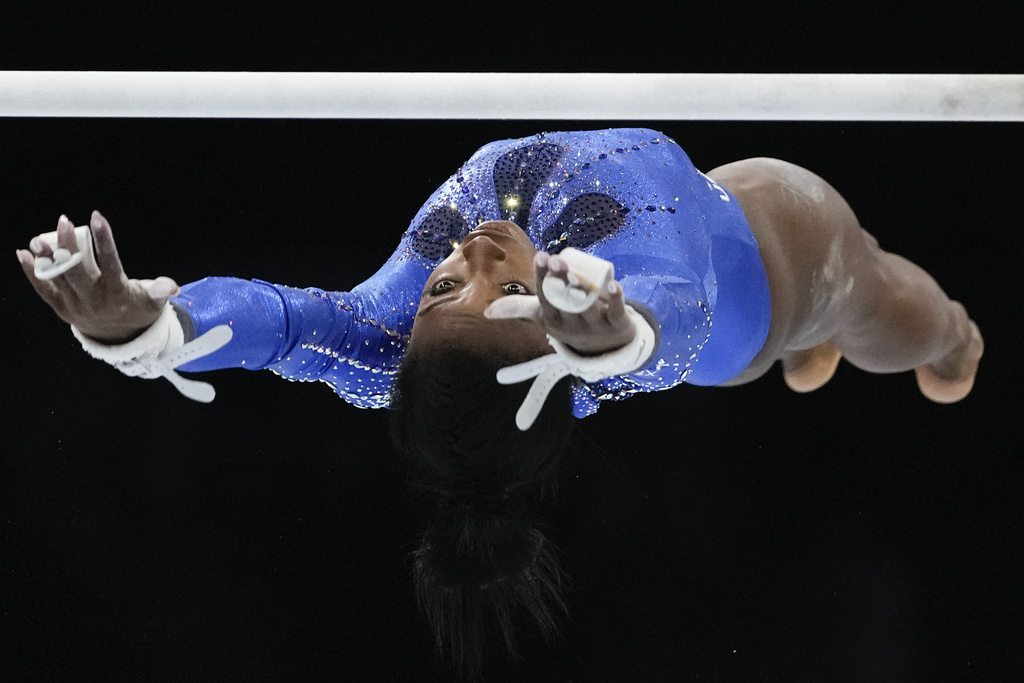 Simone Biles, statunitense, gareggia alle sbarre irregolari durante la finale a tutto tondo femminile ai Campionati mondiali di ginnastica artistica di Anversa, Belgio, venerdì 6 ottobre 2023. (AP Photo/Virginia Mayo)