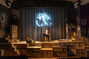 La scenografia (di Guia Buzzi) di manifesti d’epoca, di slogan politici sulla revolución e di colorati murales che ricoprono parti della scena e delle pareti del Teatro Grassi, oltre a casse di legno di varie dimensioni che dalla platea formano gradini fin sul palco, ci introduce in un interno domestico arredato di oggetti e mobilio vintage fortemente kitsch.