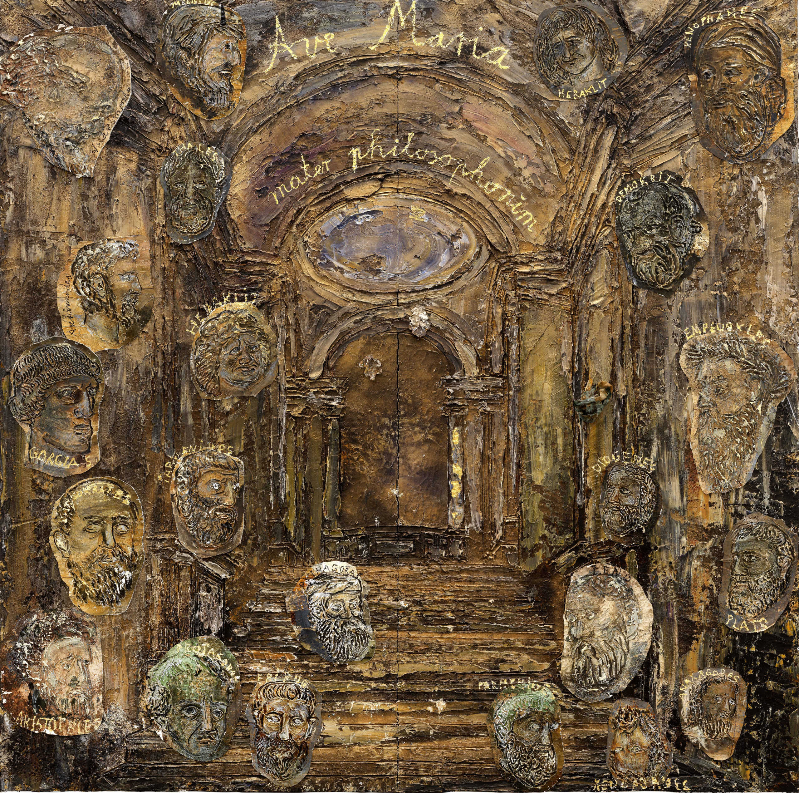 Sempre con Kiefer si incontra il dramma, l’apocalissi che però non è solo terrore e dolore, ma anche rivelazione, apertura. Ecco la sua rivisitazione della Scuola d’Atene di Raffaello, del 2022: i personaggi della filosofia antica sono forme materiche sparse, di cui si intravvedono i volti. Alla luminosa limpidezza di Raffaello si sostituisce una folla di ombre plastiche che cercano una diversa armonia. Oppure, gli interessi per la ricerca della verità lungo i secoli – e lungo lo stesso percorso personale di Kiefer – si esprimono nell’opera Vor Socrates, Prima di Socrate: un albero stecchito le cui foglie sono le immagini dei filosofi pre-socratici, a dire come sia connessa all’uomo la voglia della verità sulla vita e sulla natura.