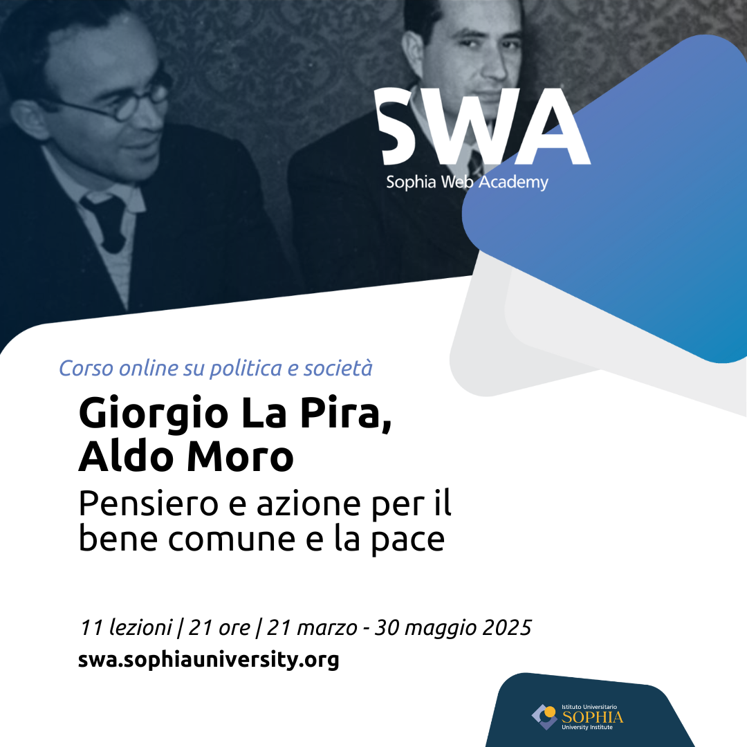 Come costruire e sviluppare la pace nei paesi democratici oggi? Forse, una via può essere quella di scoprire e approfondire il pensiero di quegli uomini che, in passato, hanno impegnato le proprie vite per diffondere la pace e il dialogo. Nasce per questo il corso online di Sophia Web Academy, “Giorgio La Pira, Aldo Moro. Pensiero e azione per il bene comune e la pace”. Il percorso, in partenza a marzo, esamina le principali categorie del pensiero e dell’azione in ambito politico e giuridico di questi due illustri personaggi storici: bene comune, città, democrazia, diritto, etica, giustizia, pace. Iscrizioni accolte entro il 3 marzo 2025.