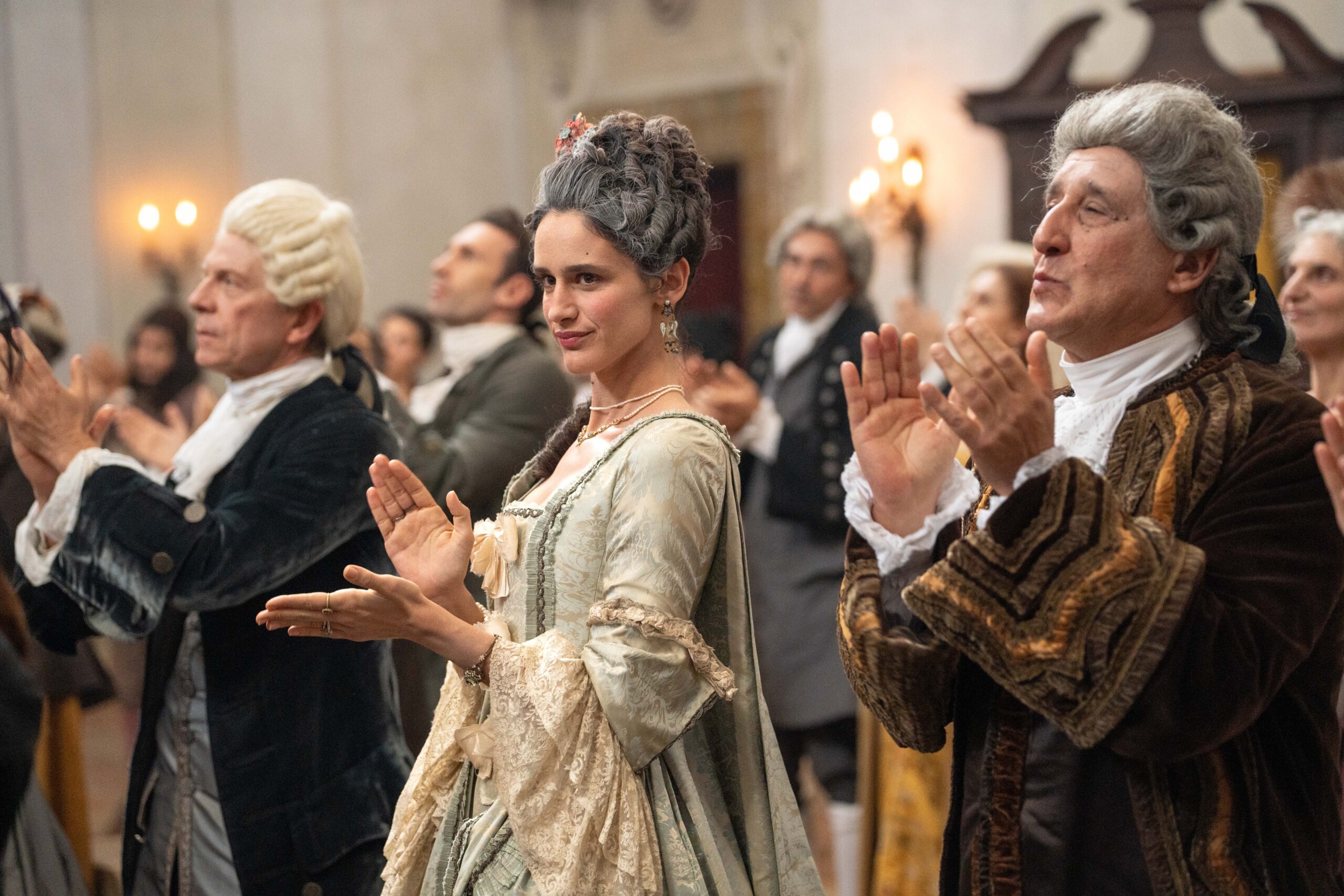 La musica dunque è amore, è libertà. Michieletto inscena un melodramma che non è una biografia di Vivaldi, ma un racconto privo di retorica di un incontro fra due anime assetate di libertà. Michele Riondino è un Vivaldi incerto umanamente, talora cupo, altre volte immerso nella musica, dagli occhi profondi. Tecla Insolia è una Cecilia bella e ribelle, che prolunga la sua forza interiore nel violino ed è assetata di vita. Il cast variegato è convincente, preciso nei dettagli – perfetti i costumi – anche se la cadenza veneziana nei dialoghi sarebbe stato opportuno accentuarla meglio (Stefano Accorsi, duro ammiraglio, ha un accento “emiliano”).