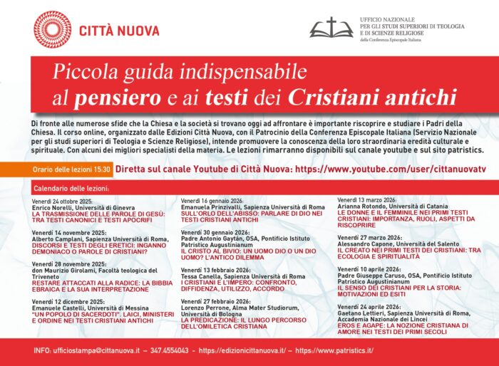 Da venerdì 24 ottobre 2025 a venerdì 24 aprile 2026 un corso gratuito online organizzato dalle Edizioni Città Nuova con il Patrocinio della CEI (Servizio Nazionale per  gli studi  superiori di Teologia e Scienze Religiose), per conoscere e approfondire la conoscenza della straordinaria eredità culturale e spirituale dei Padri della Chiesa