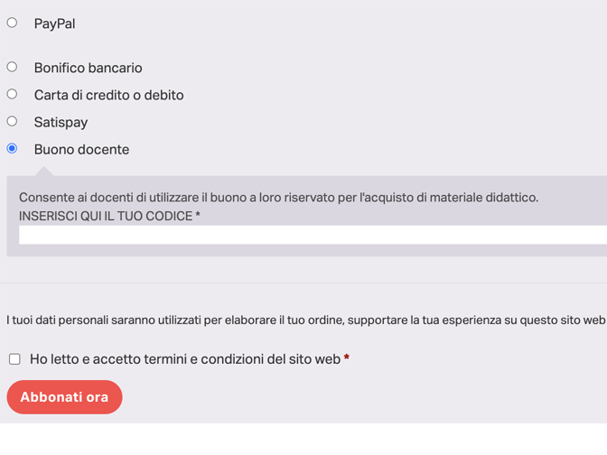 - alla cassa, seleziona come metodo di pagamento “Buono docente”;