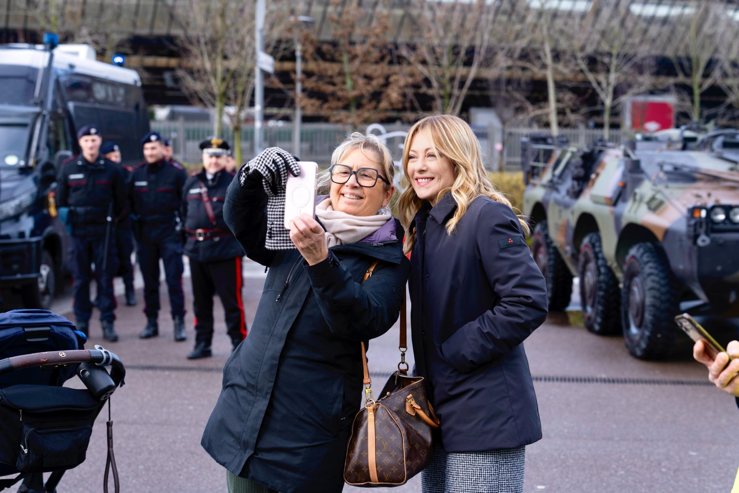 La premier Giorgia Melonisaluta alcuni carabinieri e i militari dell’esercito in servizio alla stazione di Rogoredo, Milano, 6 febbraio 2026.ANSA/Uff stampa Palazzo Chigi