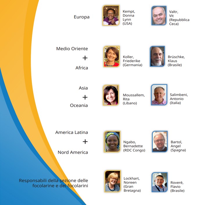 I consiglieri, provenienti da 17 Paesi e 4 continenti, rappresentano la multiculturalità che contraddistingue i Focolari. Molti di loro hanno vissuto in svariati contesti geografici, oltre quello di origine, per cui conoscono in profondità caratteristiche, necessità e sfide dei Paesi in cui vivono quanti si riconoscono nel messaggio di unità dei Focolari.