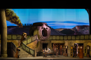 Proprio sul lato grottesco si è divertito il regista e scenografo Ersan Montdag. Se nel Gianni si è inventato un vecchio palazzo con una gran scala e il vecchio sempre nel lettone circondato da personaggi-maschere,come fossimo in un circo, nell’Heure si è spinto sul lato onirico e surreale di una stanza zeppa di immensi orologi contro un cielo in moto perpetuo e con attori-burattini grotteschi e superbarocchi. Così la simpatica parodia delle antiche farse è diventa un divertissement nostalgico – una sorta di Compte Ory rossiniano riveduto e corretto – in salsa novecentesca disincantata.