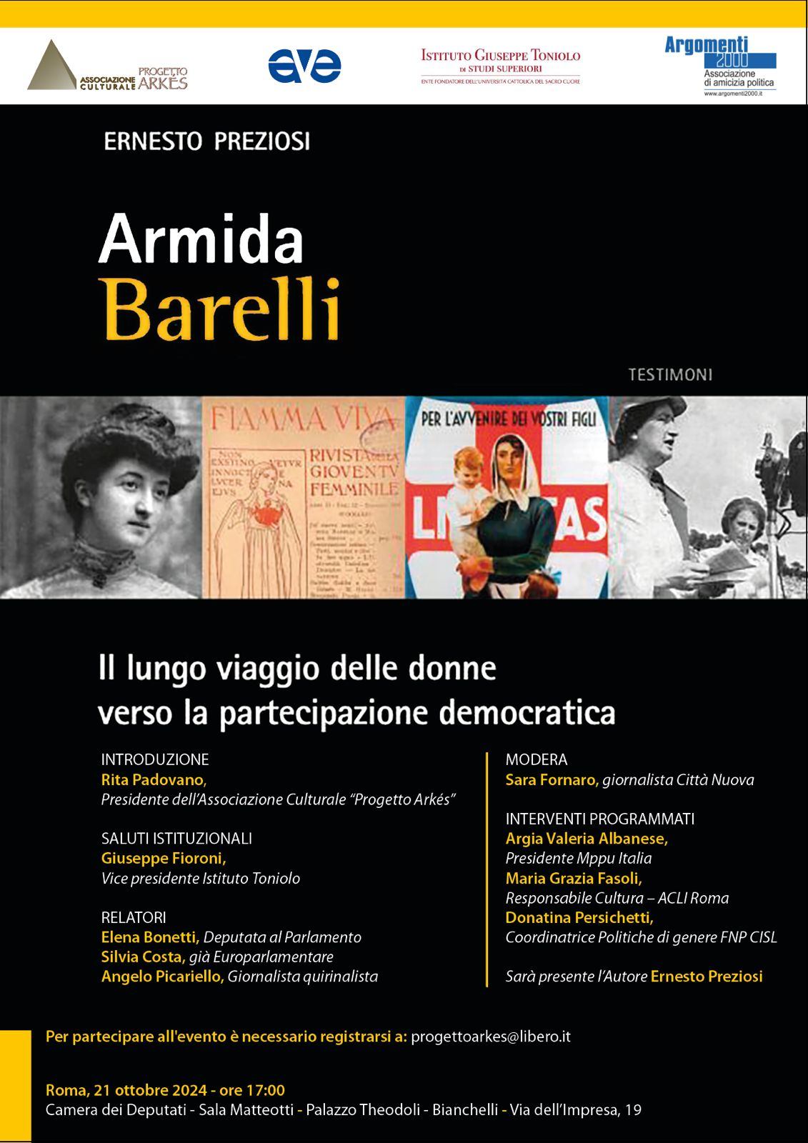 Il suo notevole contributo è oggi ancora troppo poco conosciuto, ecco perché, l’associazione culturale Progetto Arkès presieduta da Rita Padovano ha organizzato un convegno partendo dal testo “Armida Barelli, il lungo viaggio delle donne verso la partecipazione democratica” di Ernesto Preziosi (direttore del Centro di ricerca e studi storici e sociali e presidente dell’Opera della Regalità), in collaborazione con l’editrice Ave, l’Istituto Toniolo e Argomenti 2000, associazione di amicizia politica.