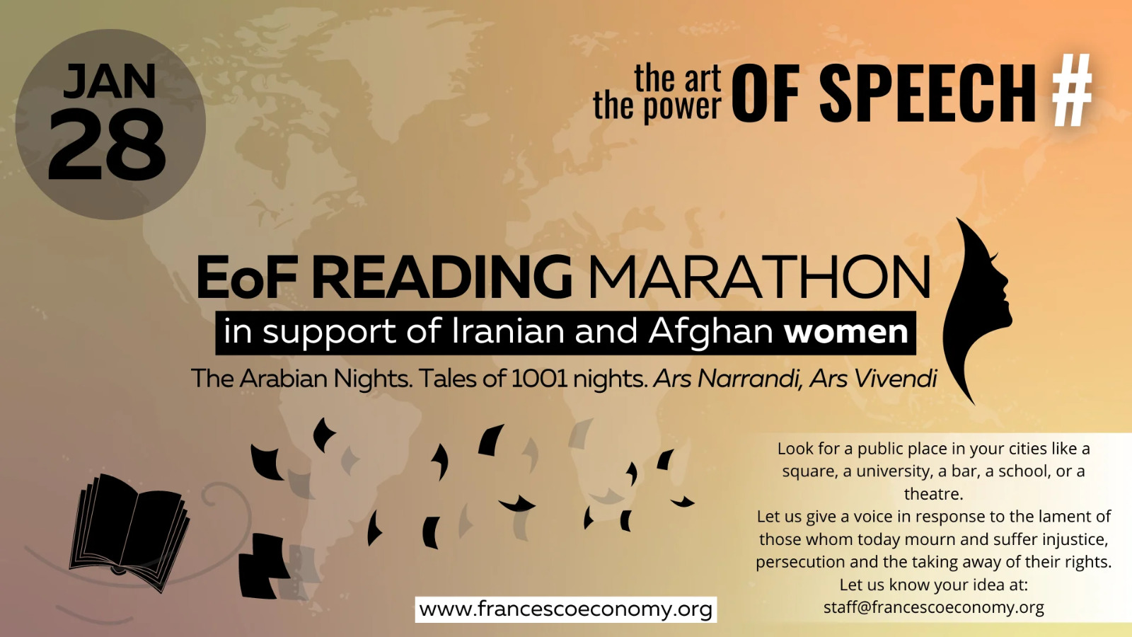Mentre in Iran il capo della magistratura, Gholamhossein Ejei, ha affermato crudelmente che «i rivoltosi saranno impiccati presto», in altre parti del mondo rispondono al grido dei manifestanti: «Fate sentire la nostra voce, non dimenticateci». Così, la proposta è quella di organizzare nella propria città una lettura di alcuni dei racconti di Le Mille e una Notte, seguita da una discussione pubblica su quanto accade in Iran e in Afghanistan.