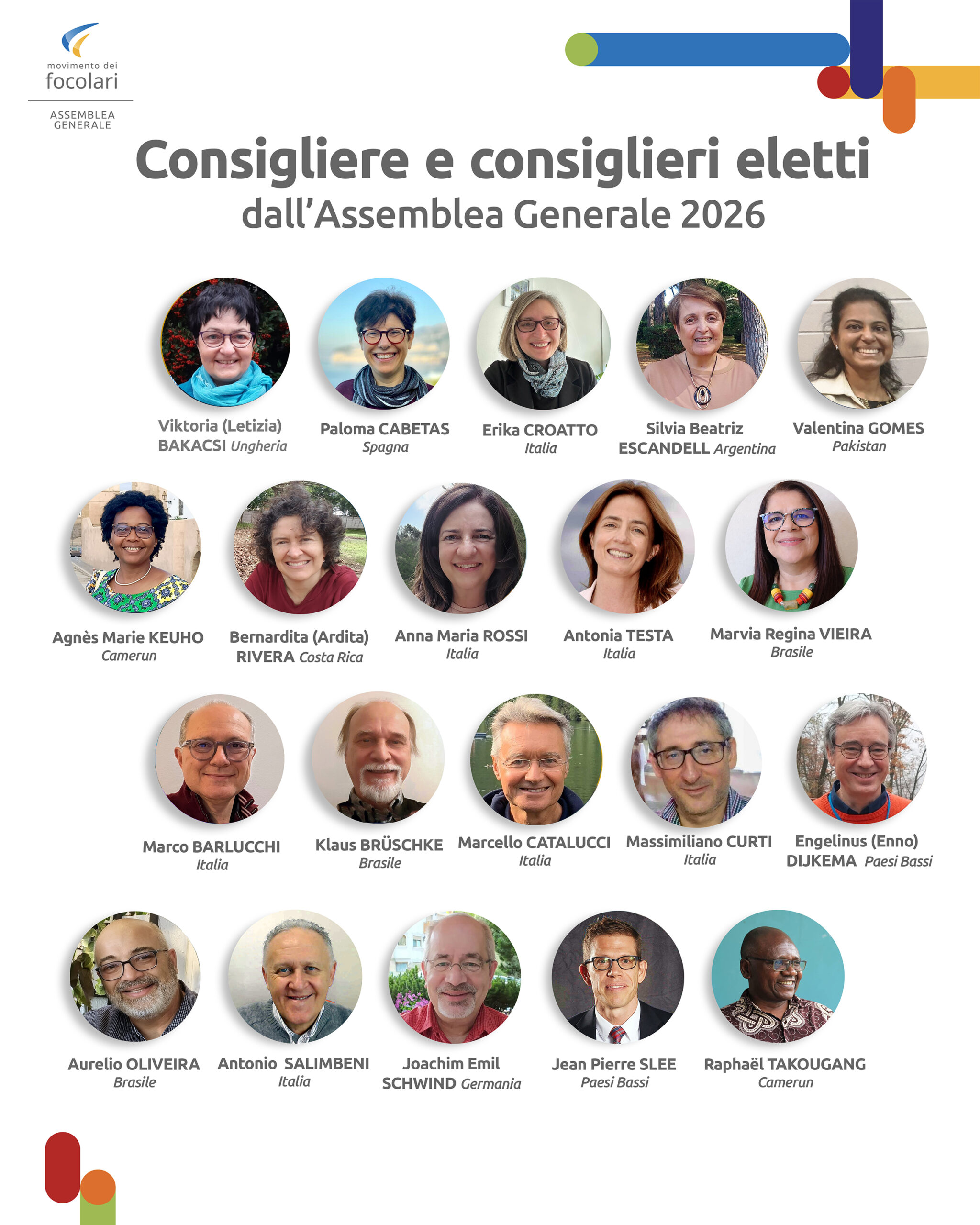 La rosa eletta – 20 componenti, 10 donne e altrettanti uomini, l’uguaglianza di genere è sempre stata prerogativa del Movimento – è parlante di per sé, per la sua varietà: geografica (dalla profonda Europa al Pakistan, dal Brasile al Camerun, dalla Colombia all’Olanda), di anagrafe (dai trentenni ai settantenni), di professione (dalla medicina all’informatica, dalla legge all’ingegneria, dalla contabilità al giornalismo), di esperienze culturali e associative.