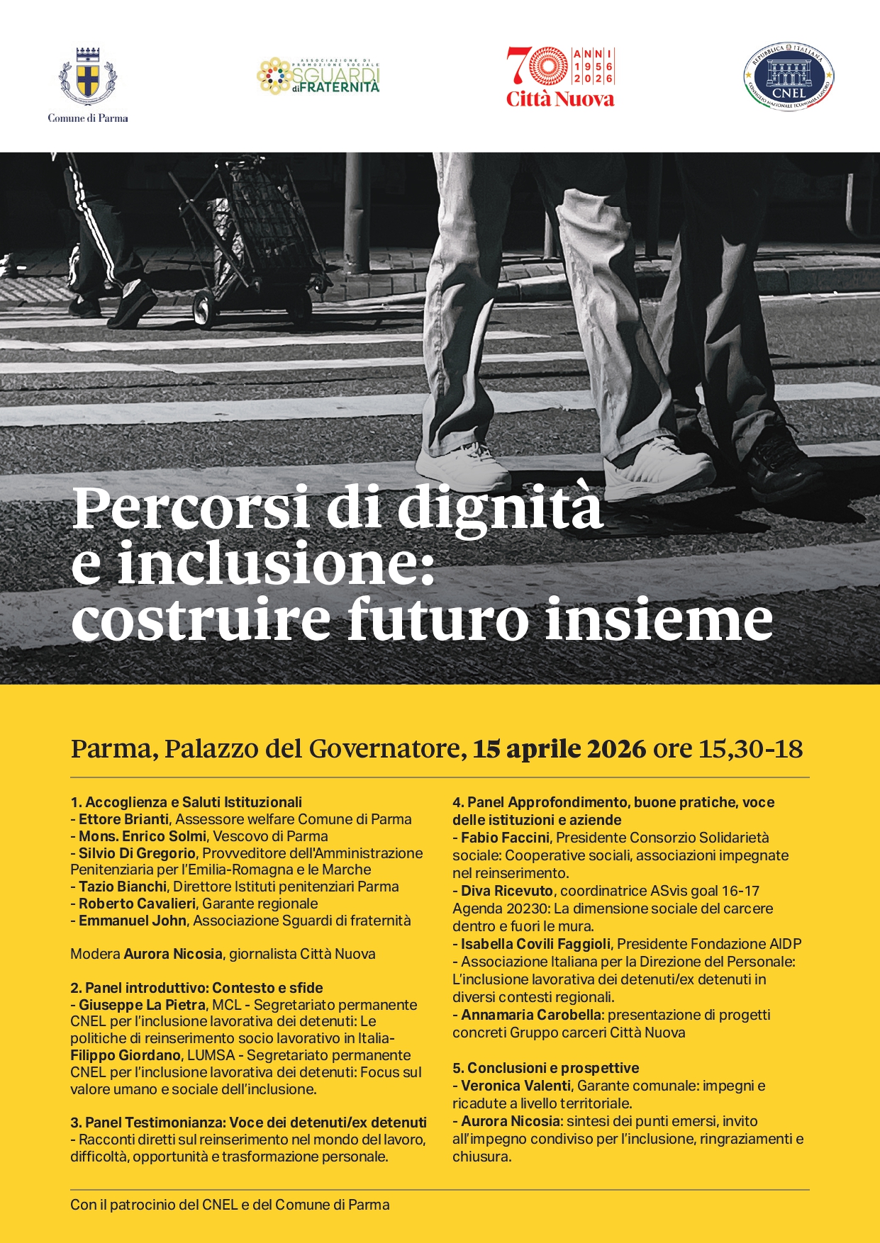 Sensibilizzare l’opinione pubblica sulla necessità di favorire l’inclusione lavorativa dei detenuti ed ex detenuti, nell’ottica di un reinserimento sociale che tenga conto della dignità di ogni persona. Questo il focus del convegno promosso da Città Nuova in collaborazione con l’associazione “Sguardi di fraternità” che avrà luogo il prossimo 15 aprile a Parma, presso il Palazzo del Governatore, dalle 15,30 alle 18. Un convegno di rilievo nazionale, rivolto ai diversi soggetti dell’ambito carcerario, che gode del patrocinio del Cnel e del Comune di Parma.