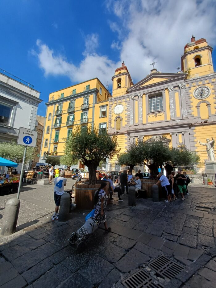 In mezzo a bancarelle di frutta e verdura, di souvenir e occhiali da sole contraffatti, di cappelli e accessori per smartphone, tablet e telefonia mobile, sgusciano cani al guinzaglio o randagi, piccioni si disputano tozzi di pane, donne cariche di borse della spesa spingono carrozzini con bambini. Un ragazzo annaffia le fioriere davanti alla chiesa. Chiacchierano animatamente o giocano a carte gli anziani che si sono accaparrati le panchine all’ombra degli olivi ornamentali. Attraversano la piazza ondate di turisti diretti ai Campi flegrei, al castello di Sant’Elmo e alla Certosa di San Martino, o da lì provenienti. Un omino sovraccarico di tatuaggi, anelli, ciondoli e orecchini si arrotola imperturbabile una sigaretta. Fanno lo slalom fra l’incessante andirivieni di persone e veicoli spericolati ragazzini su moto. E intanto un brusio, un vociare, risate e richiami s’intrecciano, si sovrappongono.