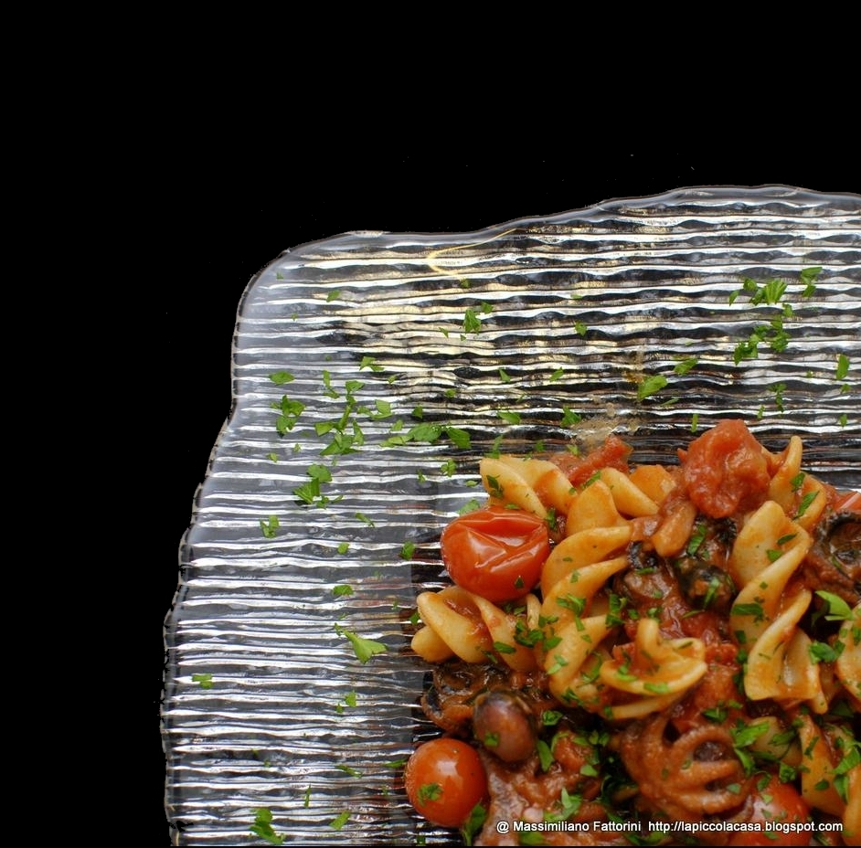 Cucina Fusilloni di kamut con polipetti di Max Fattorini Una pasta gustosa con capperi di Pantelleria e pomodorini. Dal blog La piccola casa …