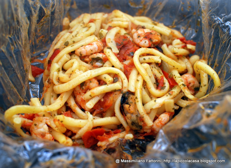 Cucina Cartoccio Fata di tagliolini all’uovo di Max Fattorini Oltre alle cozze, ai gamberi e ai pomodorini del piennolo del parco del Vesuvio, …