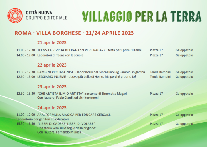Ricordiamo che si rinnova anche quest’anno l’impegno di Città Nuova al Villaggio per la Terra di Villa Borghese (Roma), contribuendo a creare il grande mosaico di iniziative volte a sensibilizzare sui temi della sostenibilità ambientale – ma non solo.