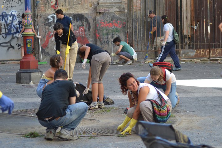 Le “pulizie di piazza” sono iniziate l’11 giugno a piazza Bellini, il salotto greco della Napoli antica (dove è visibile un tratto delle mura del VI secolo a.C.); il 26 giugno è stata la volta di piazza Banchi Nuovi, nel cuore medievale della città; l’8 luglio l’azione si è spostata ai giardinetti di Porta Capuana. Prossimo appuntamento il 24 luglio, a Piazza Santa Maria La Nova. Per saperne di più basta cliccare su www.napoliurbanblog.com, dove ci si può godere anche il video della danza sulla monnezza dei “friarielli ribelli” (tiè guerrilla gardening). Uno spasso!