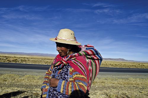 La strada verso il lago Titicaca s’illumina della Cordillera Real innevata – l’Illampu, l’Huayna Potosí e l’Illimani – che risalta sulla paglia dorata dei campi. Finché, d’improvviso, appare la prima “striscia” azzurra del mitico lago degli aymara. E in un lampo capisco perché i tessuti boliviani siano decorati a strisce sottili di colori vivaci, sono la rappresentazione della natura: terra, cielo, acqua, campi, neve, vegetazione. I mondi boliviani sono colorati e appassionanti.
