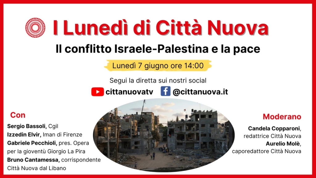 Segui la diretta lunedì 7 giugno alle ore 14 dedicata al conflitto Israele-Palestina e alle possibili vie di pace. Con Sergio Bassoli del Dipartimento politiche globali della Cgil, Izzedin Elvir, Imam di Firenze, Gabriele Pecchioli, presidente Opera per la Gioventù «Giorgio La Pira», Bruno Cantamessa, corrispondente dal Libano per Città Nuova. Seguiteci su Facebook o su Youtube.