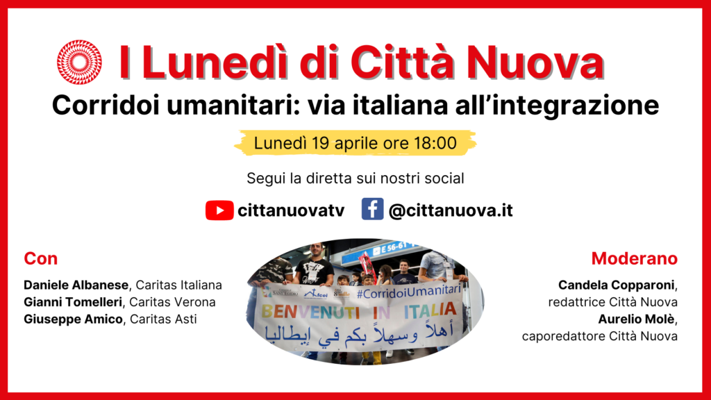 I corridoi umanitari costituiscono un nuovo sguardo sull’accoglienza e un’alternativa efficace all’immigrazione irregolare. Ne “I lunedì di Città Nuova” del prossimo 19 aprile alle ore 18 ne parliamo con Daniele Albanese,  Caritas italiana, Giuseppe Amico, Caritas Asti, Gianni Tomelleri, Caritas Verona.
