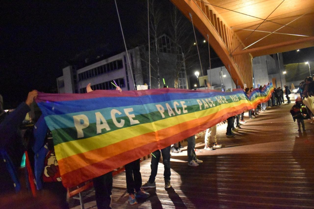 Si srotola la lunga bandiera della pace, si ringraziano tutti i presenti che hanno saputo fermarsi ed unire la loro voce per ribadire la necessità di fermare «la criminale follia di tutte le guerre, la corsa al riarmo, la distruzione del Pianeta».