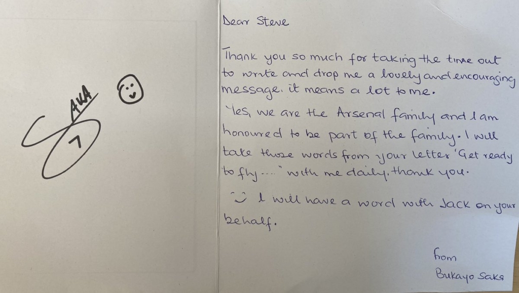 Un messaggio scritto da padre che non aveva certo pretese di risposta. Byrne non si aspettava che domenica scorsa invece arrivasse una replica scritta a mano dal giovane campione. «Stavo facendo un pisolino pomeridiano quando ho sentito suonare il campanello: non ho risposto alla porta perché ero troppo stanco. È stato solo il lunedì successivo che ho visto la lettera sul mio tappetino e l’ho aperta per scoprire che avevo ricevuto una risposta da Saka. Ho solo pensato ‘oh mio dio’. Il calciatore più famoso del Paese mi aveva mandato un biglietto. Non me lo aspettavo, anche se la mia era una bella lettera e speravo che la leggesse». «Grazie, significa molto per me», ha risposto tra altre parole il giocatore nella lettera pubblicata sui social da Byrne e che riportiamo. Se il calcio è dei tifosi, è giusto che i tifosi scelgano quale stile adottare: senza dubbio, noi scegliamo il tifo di Byrne.