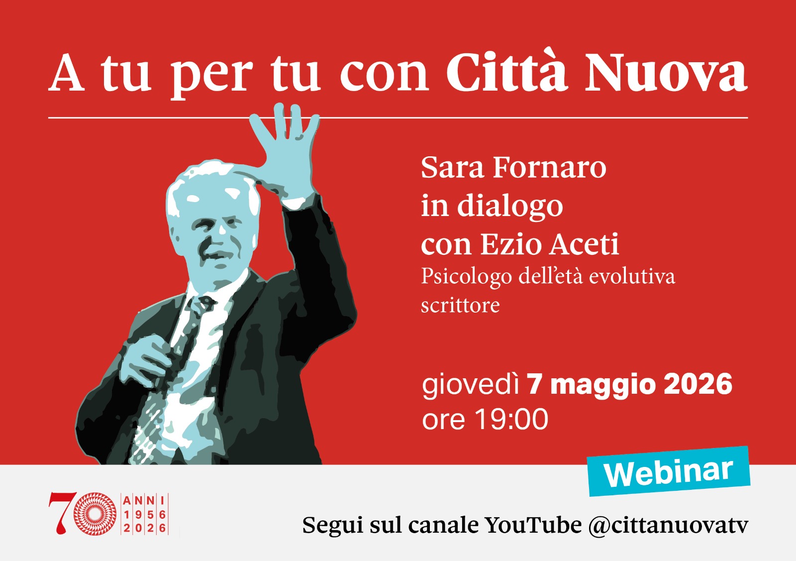 Il 7 maggio dalle 19, segui la diretta di Città Nuova con lo psicologo dell’età evolutiva Ezio Aceti in dialogo con la giornalista Sara Fornaro. L’incontro si svolgerà sul canale YouTube @cittanuovatv e verranno affrontati e commentati temi di attualità legati al mondo dell’educazione, della gestione delle emozioni, tematiche familiari…