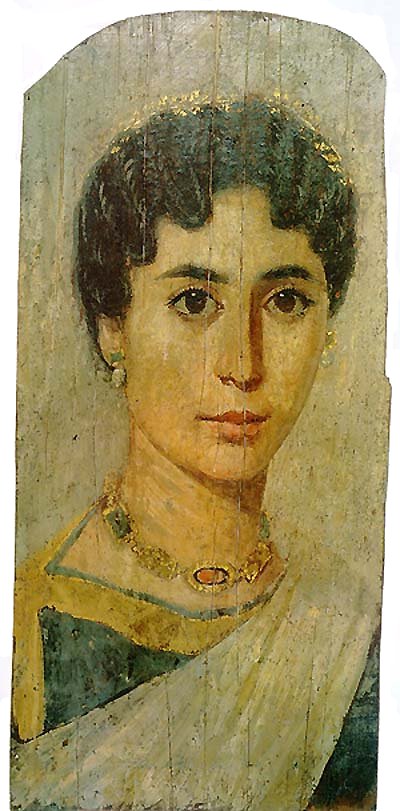 Espressione di arte greca, dunque, ma al tempo stesso di una cultura di stampo romano, a giudicare da acconciature, vestiario e gioielli, specchio puntuale della moda dell’Urbe; e per di più applicati su mummie egiziane, quasi ad appagare quell’esigenza di eternità che ha sempre caratterizzato il popolo del Nilo. Un insieme, insomma, così particolare da fare di tali ritratti un unicum nel panorama della storia dell’arte antica. Dietro ognuno s’indovina una storia. Alla giovane donna dalle vesti in malva e lavanda, stroncata forse da una malattia mortale, non resta che sfoggiare i suoi stupendi gioielli: orecchini con perle e una collana d’oro.