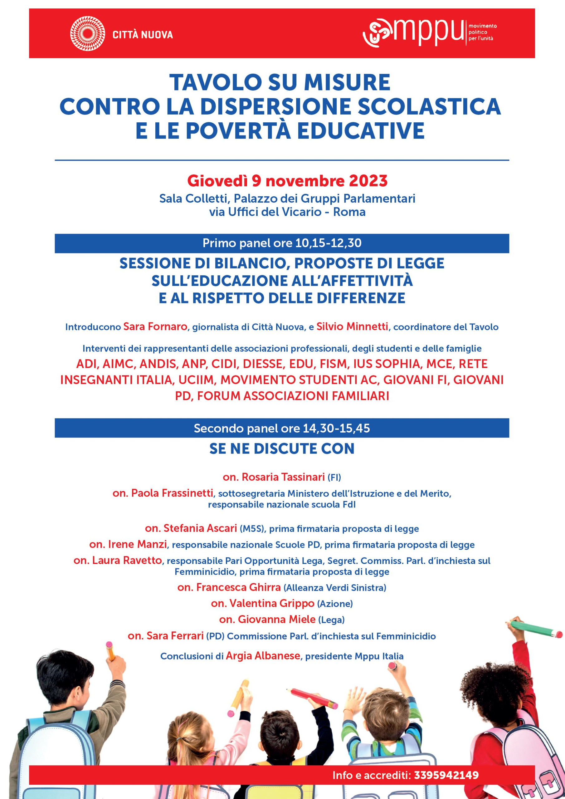 Sull’educazione all’affettività e al rispetto delle differenze nelle scuole c’è una proposta del Tavolo sulle misure contro la dispersione scolastica e le povertà educative, coordinato da Silvio Minnetti e promosso dalla rivista Città Nuova e dal Movimento politico per l’unità Italia, presieduto da Argia Albanese. Insieme ad una quindicina di organizzazioni (Adi, Aimc, Andis, Anp, Cidi, Diesse, Edu, Fism, Ius Sophia, Mce, Rete insegnanti Italia, Uciim, Movimento studenti di Azione cattolica, Giovani di Forza Italia, Giovani del Pd, Forum delle Associazioni familiari) il tavolo ha presentato una bozza di punti condivisi dalle diverse associazioni professionali della scuola, dagli studenti e dalle famiglie.