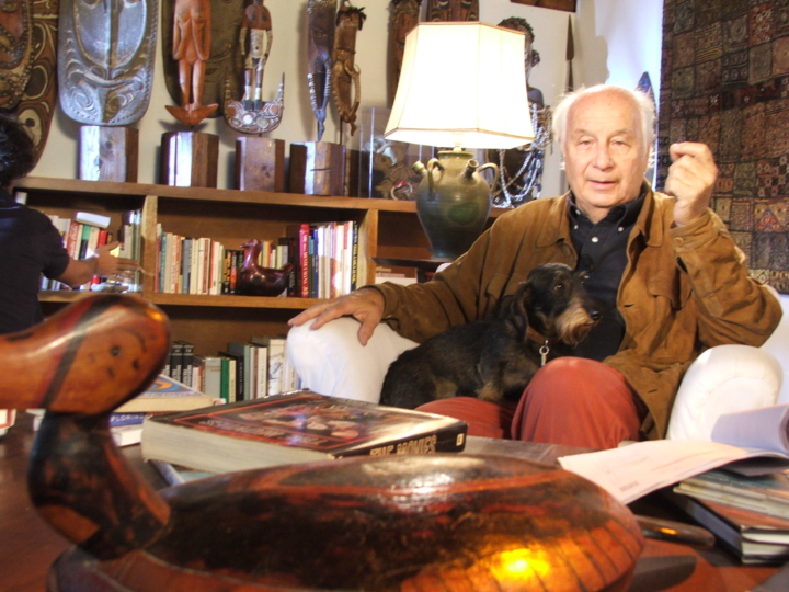 Dopo quell’avventura per mare, qualche anno dopo, nel 2009, tornammo a lavorare insieme per un’altra serie, questa volta dedicata alle sue imprese terrestri. Volle girare nel suo casale di campagna, a Ficulle, nella sala dove si trovavano le sue maschere tribali, provenienti da vari paesi africani e dall’Oceania. L’altro protagonista della serie divenne lo scodinzolante Pioppo, che in barba ai nostri tentativi di trattenerlo, finiva sempre per acciambellarsi sulle gambe del suo amico, durante le interviste. La magia si ripeté. La consuetudine e la devozione di tutta la troupe, lo misero ancor più a suo agio, e così, ci aprì le porte di quel luogo, svelandocene le meraviglie, prima fra tutte, il suo archivio fotografico. Ricordo che ce lo mostrò orgoglioso in un pomeriggio di pausa, facendoci tenere tra le mani le diapositive preziose delle sue foto nelle isole di Tuamotu, nella Polinesia Francese. Consisteva, ci disse, in oltre un milione di immagini fotografiche, su diapositive colore di formati diversi, e ci raccontò che lo stava riorganizzando perché era sua intenzione donarlo all’Archivio Alinari, cosa che effettivamente fece, qualche tempo dopo.