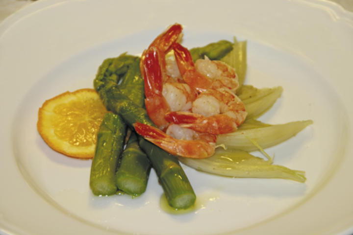Gamberi con asparagi e finocchi in salsa all’arancia