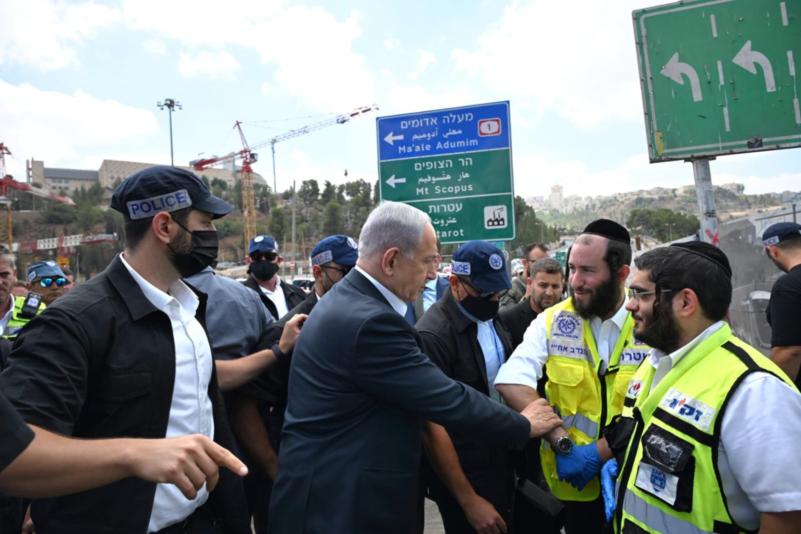 Il premier Benyamin Netanyahu e il ministro Itamar Ben Gvir sul luogo dell’attentato a Gerusalemme, 8 settembre 2025. ANSA/UFFICIO STAMPA OCEAN RACE EUROPE