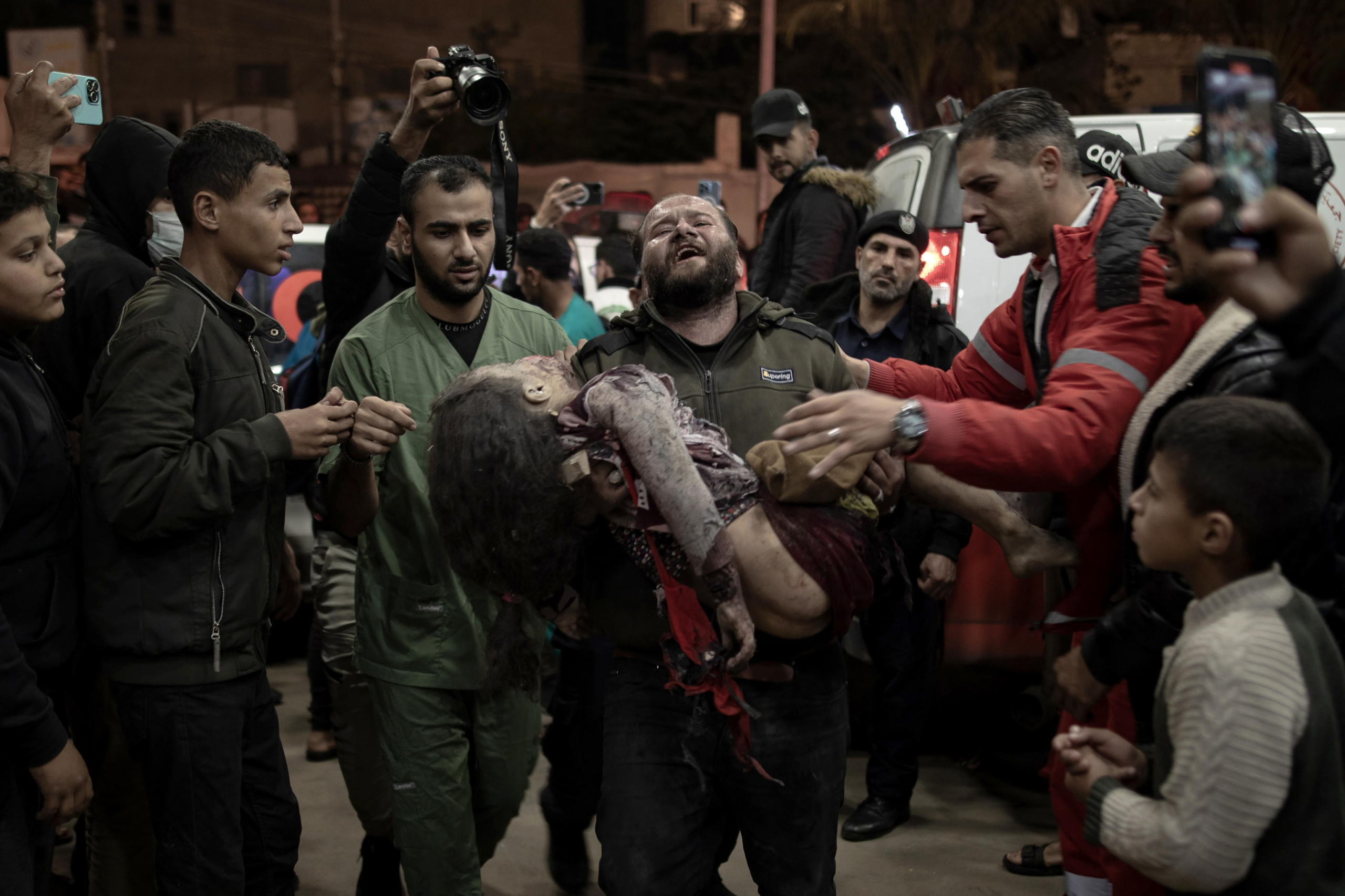 Un uomo trasporta una bambina ferita all’ospedale Nasser di Khan Yunis, nel sud della Striscia di Gaza, il 6 gennaio 2024, a seguito degli attacchi aerei israeliani nel sud di Gaza. Foto: EPA/HAITHAM IMAD ATTENTION EDITORS: GRAPHIC CONTENT, via ANSA