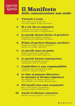 Circola da vari anni soprattutto nelle scuole il Manifesto della Comunicazione non ostile, scritto e diffuso dall’associazione Parole O_Stili. Cos’è? Si tratta di un decalogo che mette in luce alcuni comportamenti che dovrebbero essere la bussola nel rapportarci verbalmente con gli altri in particolar modo sui social. È rivolto ai ragazzi, ma noi adulti dovremmo ripartire dal prendere atto di queste regole importanti. Mi è tornato in mente oggi che si celebra come ogni anno la Giornata mondiale della gentilezza e rileggendolo mi ha colpito il secondo punto: “Si è ciò che si comunica”. Direi anche di più: si è ciò che si pensa. Ma chi voglio essere? Ciascuno risponda per sé. Mi ha colpito soprattutto in riferimento al momento storico che stiamo vivendo, di fratture, di polarizzazioni, di prese di posizione ostentate, in cui ciascuno vorrebbe e dovrebbe esprimere in tutti i modi cosa e come la pensa. Penso faccia parte del nostro essere cittadini consapevoli la possibilità di potersi informare e confrontare esprimendo la propria idea per sapere davvero chi si è, perché, come dice il Manifesto all’ultimo punto, “Anche il silenzio comunica”.