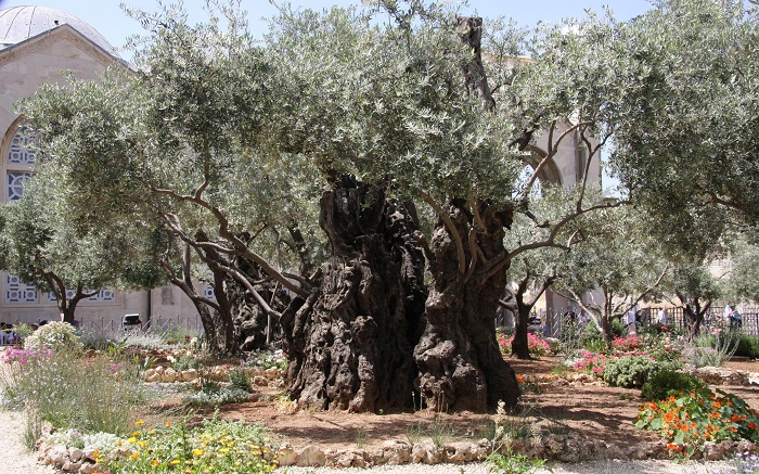 La tradizione vuole che 8 ulivi presenti nel piccolo giardino accanto alla basilica dell’Agonia abbiano fatto da scenario a quella accorata supplica accompagnata da sudore di sangue: ciò che però verrebbe smentito dalle notizie storiche riferite da Giuseppe Flavio a proposito dei romani, che nel 70 d. C. fecero tagliare tutti gli alberi negli immediati dintorni di Gerusalemme per avere campo libero nel loro assedio alla città. Inoltre studi recenti condotti sulla parte aerea degli esemplari più antichi, quelli sopravvissuti alla distruzione della primitiva chiesa e agli anni di abbandono, li datano all’epoca dei crociati. Il che non esclude la loro discendenza dalle piante esistenti al tempo di Gesù, grazie alla capacità – attestata già da Plinio il Vecchio – che ha l’olivo di rinascere sempre dal medesimo ceppo. Ma la scoperta più sorprendente, emersa dalle ricerche, è la comune origine degli 8 ulivi da una stessa pianta madre, forse perché ritenuta testimone della notte di agonia di Gesù: un’origine attestata dal possedere lo stesso Dna.