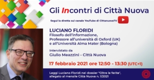 Una settimana ricca di appuntamenti. Si comincia con la consueta diretta de “I lunedì di Città Nuova” sulla pagina Facebook ufficiale della testata. Ci si rivede mercoledì 17 febbraio sul canale Yotutube di Città Nuova per l’intervista di Giulio Meazzini al filosofo Luciano Floridi. Infine giovedì 18 e venerdì 19 si terrà un convegno di due giorni per comprendere l’eredità del pensiero di Chiara Lubich, sempre su canale Youtube di Città Nuova.