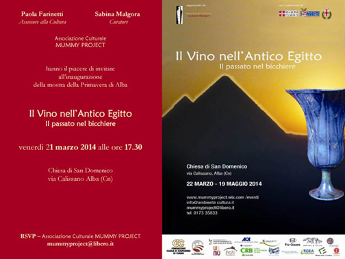 Quando si parla del vino nell’antichità, si pensa sempre al Noè biblico, ai vasi greci dove sono dipinte grandi bevute o a quelli degli etruschi che banchettavano parecchio. Ad Alba, nel cuneese, terra di vini eccellenti, Sabina Malgora ha apprestato una mostra esclusiva su un tema inedito, cioè "Il Vino nell’antico Egitto", dal sottotitolo accattivante “Il passato nel bicchiere”.