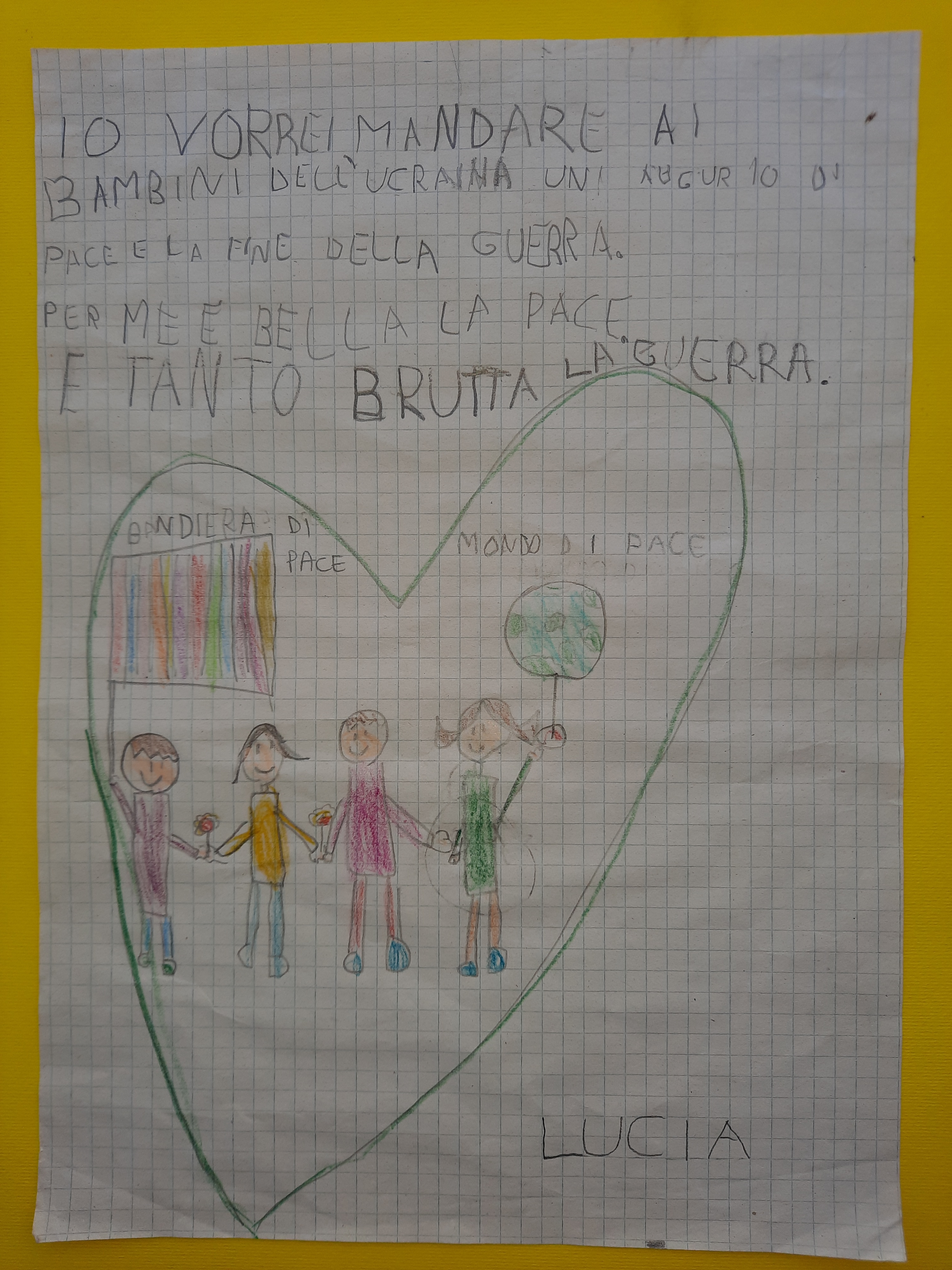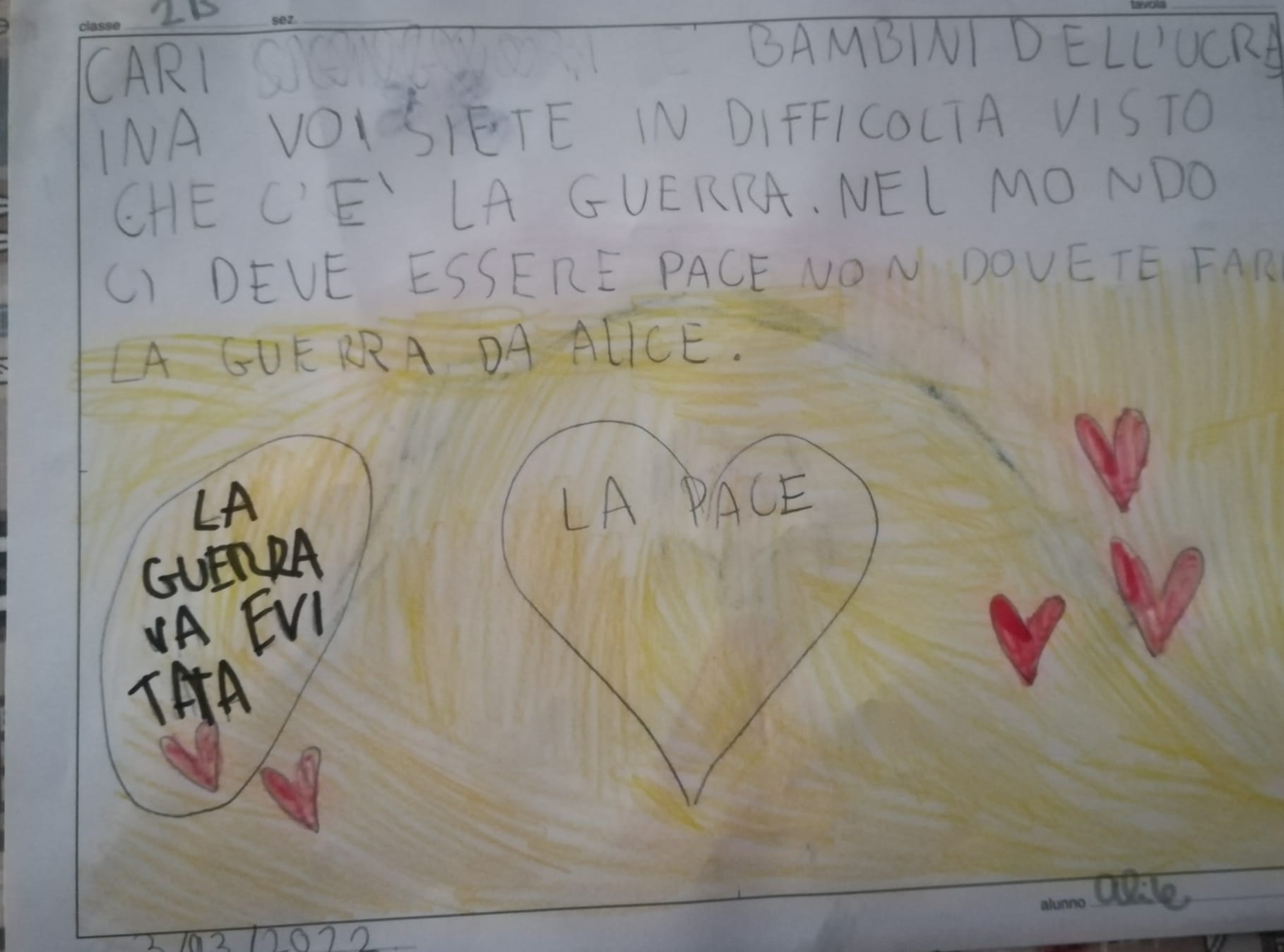 Scrive Niccolò: «Noi non vogliamo la guerra. Noi vogliamo la pace. La guerra non si fa. La guerra è brutta. Se avete paura della guerra non vi preoccupate, venite da me, ci divertiremo un mondo!». Anche Alice scrive ai bambini dell’Ucraina, che sono in difficoltà e chiede che ci sia la pace nel mondo.