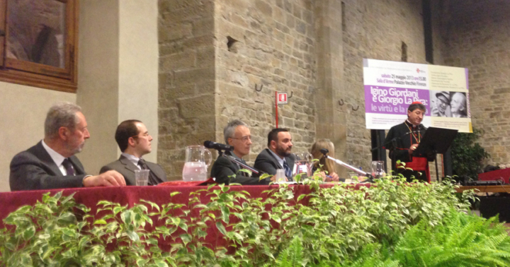 «Due padri che hanno attraversato decenni oscuri e che oggi, ove la separazione di etica e politica sembra una sorta di destino del quale siamo prigionieri e dal quale non riusciamo a liberarci, ci mancano». Così il professor Sergio Givone, assessore alla Cultura del Comune di Firenze, ha aperto il convegno “Igino Giordani e Giorgio La Pira: le virtù e la politica", salutando i partecipanti che hanno gremito la Sala d’arme di Palazzo Vecchio lo scorso Sabato 25 Maggio.