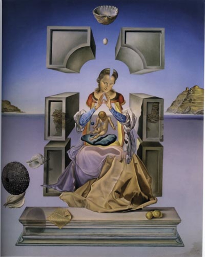 Dalì infatti vede ciò che esiste in una realtà che non solo lo trascende, ma lo trasforma. Possono risultare queste metamorfosi stridenti, incomprensibili; o dolci, spirituali. Sempre, egli vi innesta una tensione immaginativa che è “oltre”. Dalì non va al di là delle cose, c’è già. Prima di noi. Per questo la sua è un’arte difficile, talora manierata, anche commerciale. Ma sempre, con un guizzo di originalità, un’ansia di creare qualcosa di nuovo. Può passare dal Ritratto della sorella (1925), energico come una dama del Quattrocento, all’Eclisse e osmosi vegetali (1934) di uno spazio giallo oltremondano, con il cavallo che diventa edera; rivisitare la Leda leonardesca, ritraendovi la moglie in un paesaggio lunare, o sublimare (e ritrovare) la madre nella Madonna di Port Ligur, frammento intimo sospeso sopra il chiaro mare della storia (perché Salvador ha un senso formidabile della storia, come pochi artisti).