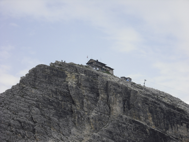 La mattina, uscendo, incontriamo gli amici bellunesi appena alzati: saranno dei gran camminatori, ma dei gran mattinieri no di sicuro. Tiriamo fuori dagli zaini le lampade frontali per percorrere la galleria del Lagazuoi, costruita dai soldati italiani durante la Prima guerra mondiale per sorprendere gli austriaci che occupavano la cima: un ripido tunnel elicoidale, lungo il quale si aprono ogni tanto splendidi scorci, che ci porta fino a Passo Falzarego. Da lì saliamo a rifugio Averau, dove ritroviamo la coppia bellunese: non solo sono partiti dopo, ma sono passati da rifugio Dibona, Cinque Torri, Scoiattoli, e ora ci superano. Tra l’umiliato e l’ammirato, proseguiamo verso rifugio Nuvolau, altro punto panoramicamente strategico: all’orizzonte appaiono minacciose nuvole nere. Meglio sbrigarsi a scendere per il sentiero attrezzato.