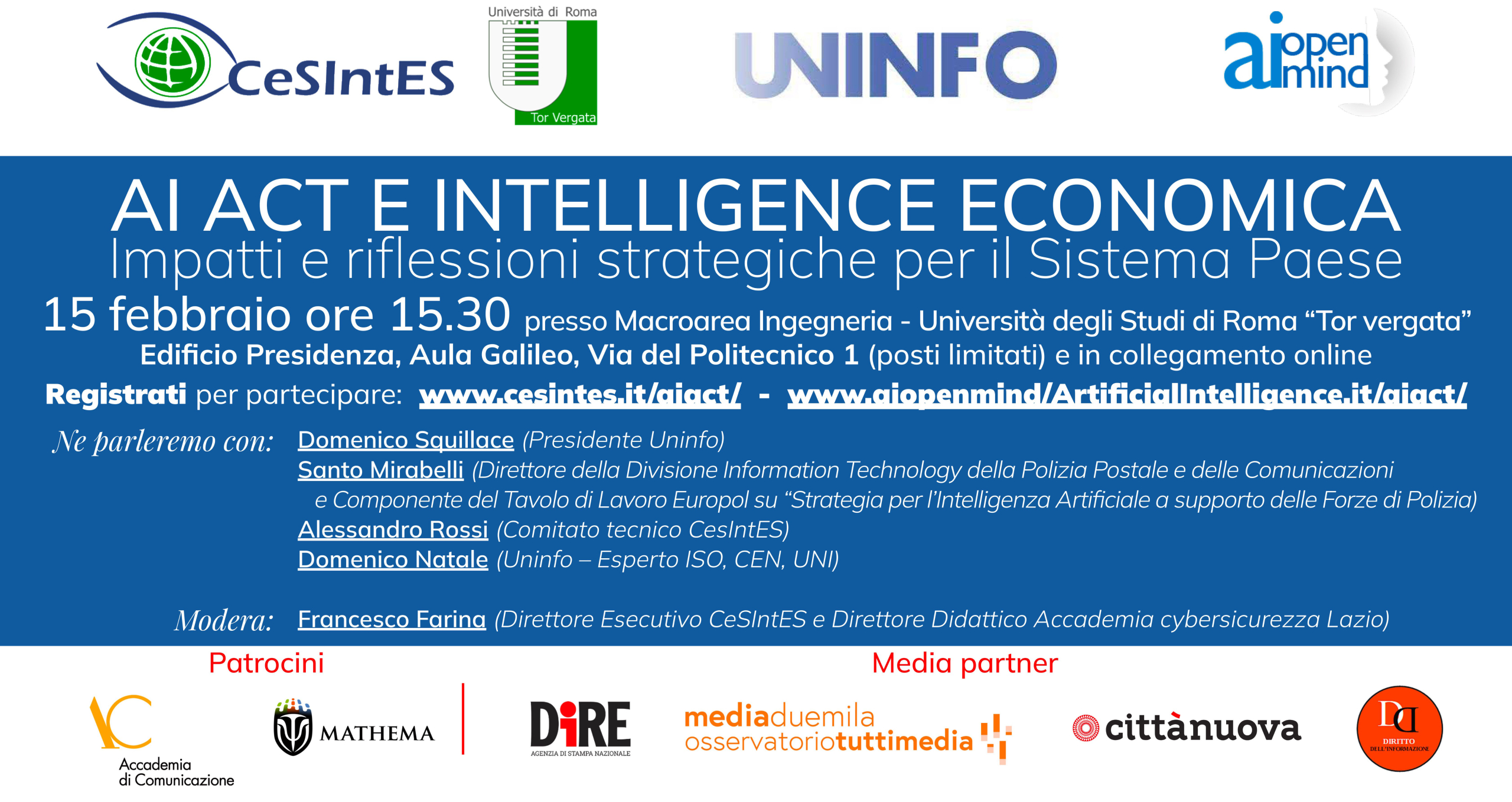 Un’occasione di studio e confronto ci sarà giovedì 15 febbraio alle 15.30 presso l’Università Tor Vergata e, per chi non potrà essere presente, anche online, dopo essersi registrati, grazie al convegno dal titolo “AI Act e Intelligence Economica. Impatti e riflessioni per il Sistema-Paese”.