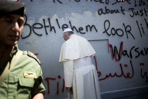 Lasciato il Palazzo presidenziale per dirigersi verso la Piazza della Mangiatoia, il percorso prevede il passaggio vicino al muro di divisione tra Betlemme e Israele. Il papa ha chiesto di fermare la jeep, da cui è subito sceso per avvicinarsi al muro, vi ha sostato davanti raccogliendosi in preghiera per qualche minuto. Poi è avanzato sino a poggiarvi la fronte, a condividere fisicamente la sofferenza di un popolo. La sosta non era prevista dal programma, ma non è irrituale in papa Francesco, che qui è mosso da una consapevolezza confessata: «È difficile costruire la pace, ma vivere senza pace è un tormento».
