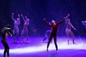 Quel brulicante mondo animale e bucolico illuminato da luci iridescenti, è un luogo astratto, un giardino idilliaco, uno spazio inviolato, circondato da quinte trasparenti dietro le quali s’avvertono i danzatori muoversi o sostare, poi uscire saltellando, scrutare il territorio, formare il gruppo, turbinare compatti, distaccarsi per vibrare in assoli, duetti, terzetti e ritornare sempre nel drappello. Sono sequenze che aprono a visioni dell’anima. Come nel finale, quando sui danzatori cadono leggeri fiocchi di neve e petali rossi, mentre le voci della Messa in si minore Crocifixus si spengono lasciandoci nel silenzio con la danza senza fine di una coppia.