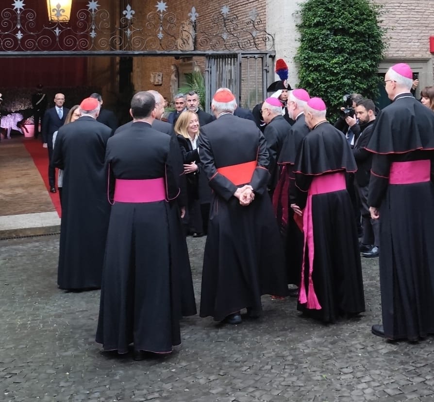 La presidente del Consiglio Meloni saluta vescovi e cardinali, tra cui il segretario di Stato vaticano Parolin, il presidente della Cei Zuppi e il segretario Baturi, a palazzo Borromeo, sede dell’ambasciata italiana presso la Santa Sede. Foto di Sara Fornaro