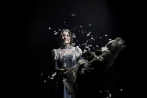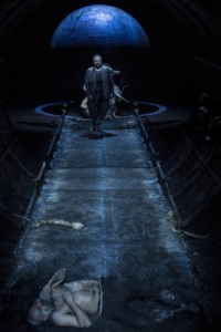 Sventrata la platea e prolungato il palcoscenico con un’ampia passerella che ingloba una parte degli spettatori e fuoriuscite laterali dal basso, la scena ci immerge in un mondo cupo, devastato, violato: una terra dove s’intrecciano e si confondono esseri dall’amore malato, innocenti e peccatori, ombre inquietanti che si proiettano l’uno contro l’altro, che invadono terreni di malaffare e di uccisioni nascoste.