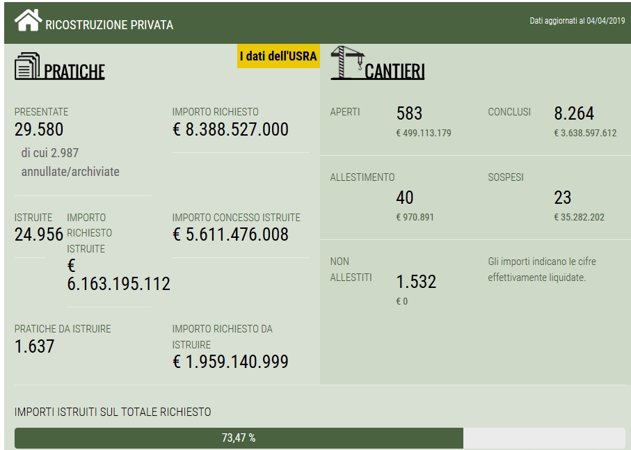 Secondo i dati dell’Usra, l’Ufficio speciale per la ricostruzione dell’Aquila, è stato avviato il 73,47% delle pratiche edilizie private e solo il 60,97% di quelle pubbliche. Degli oltre 2 miliardi e 300 milioni di euro richiesti finora, ne sono stati erogati solo 1 miliardo e 414 milioni.