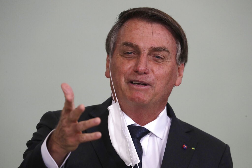 Il presidente del Brasile Jair Bolsonaro con la mascherina appesa all’orecchio (AP Photo/Eraldo Peres)