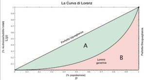 Ma c’è un indicatore ancora più sintetico per descrivere efficacemente il livello di disuguaglianza, calcolabile per le popolazioni di qualsiasi area geografica. Si tratta del coefficiente di Gini, elaborato dallo statistico italiano Corrado Gini e pubblicato nel suo articolo del 1912 “Variabilità e mutabilità”. Partendo dalle curve di Lorenz e calcolando le aree relative A e B, attraverso un rapporto A/(A+B) si giunge ad un indice che varia fra 0 e 1, riportabile su base 100, e quindi facilmente comprensibile. Quando il valore è 0 si ha perfetta uguaglianza, quando il valore raggiunge 100 si ha invece la massima disuguaglianza nella distribuzione della ricchezza.
