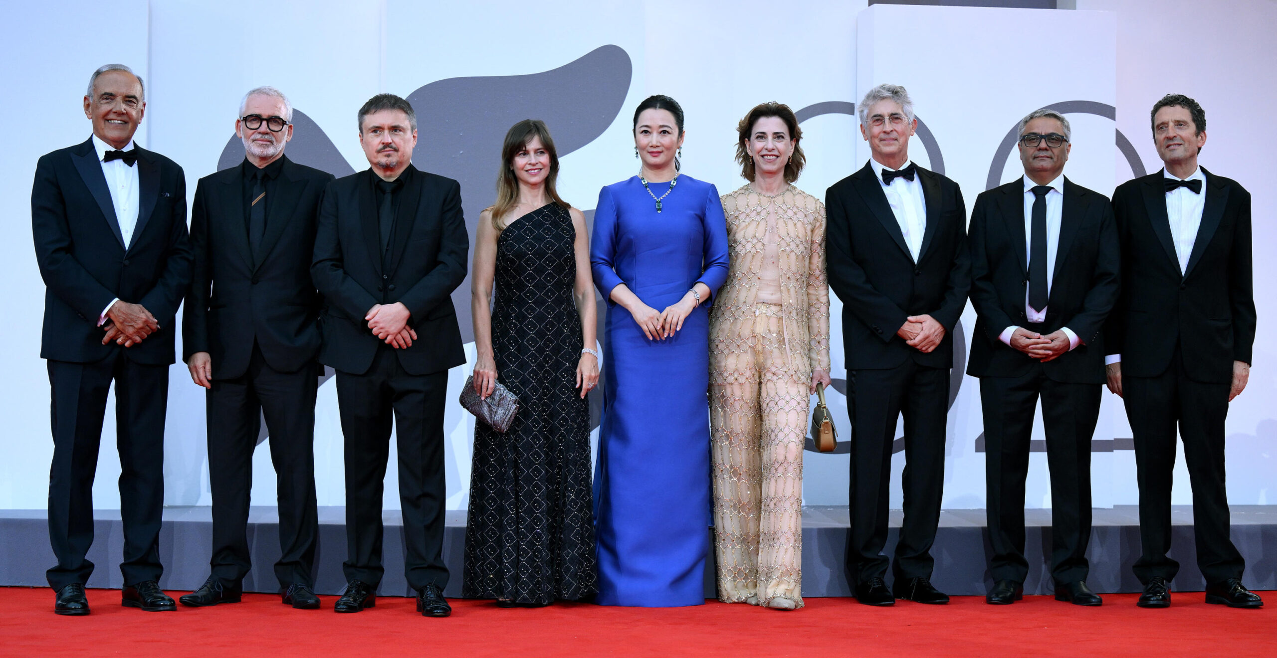 Da sinistra, il direttore del Festival del cinema di Venezia, Alberto Barbera, i giurati Stephane Brize, Cristian Mungiu, Maura Delpero, Zhao Tao, Fernanda Torres, il presidente Alexander Payne, Mohammad Rasoulof e il presidente della Biennale, Pietrangelo, 27 agosto 2025. ANSA/ETTORE FERRARI